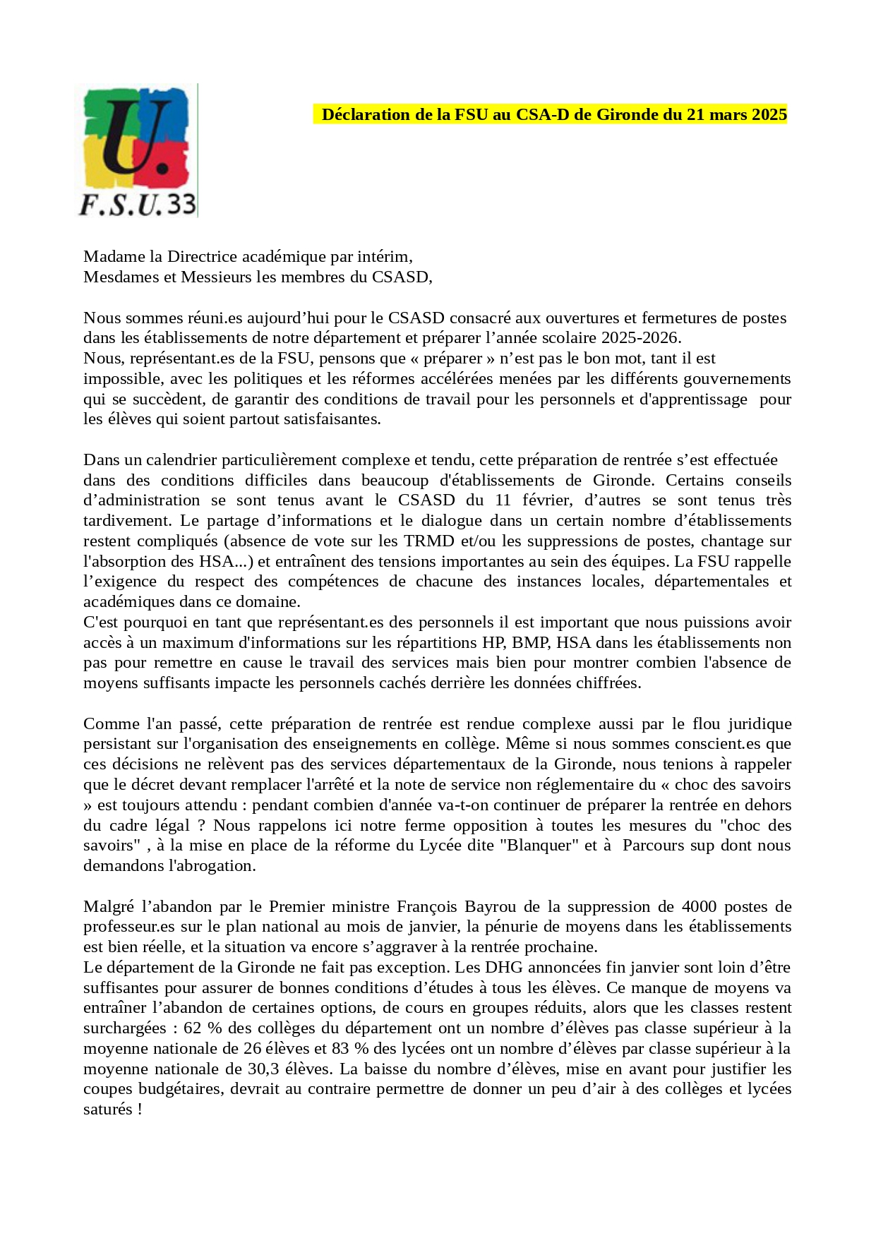 Vous êtes ici : Accueil Snes Gironde Instances départementales Déclaration liminaire de la FSU au CSAD du 21 mars 2025 26 mars 2025 Snes Gironde Déclaration liminaire de la FSU au CSAD du 21 mars 2025 Partager l'article sur Facebook Partager l'article sur Twitter Partager l'article via Addthis Imprimer l'article Envoyer l'article par email Déclaration en PDF :