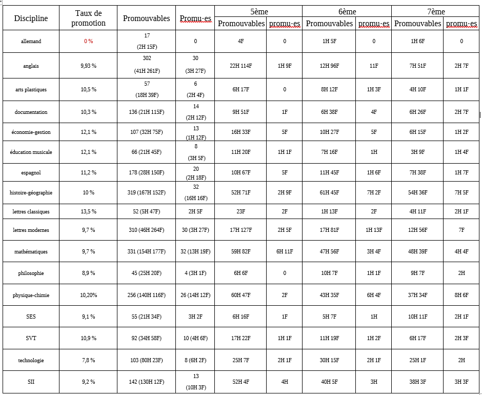 es. Dans le détail :- 7e : 99 promu es, 40H et 59F