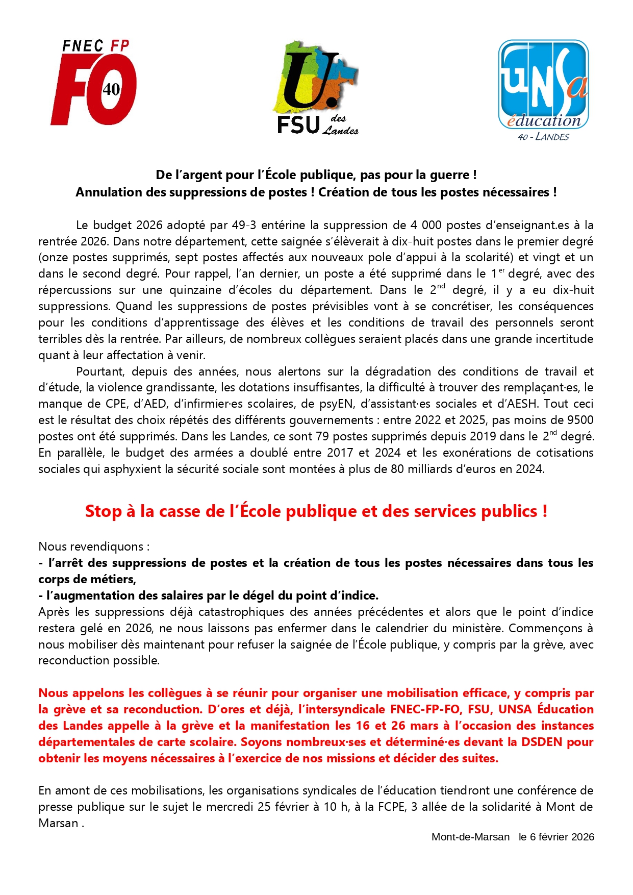 Vous êtes ici : Accueil Snes Landes actualités Mobilisation les 16 et 26 mars Stop à la casse d’Ecole Publique 26 février 2026 Snes Landes Mobilisation les 16 et 26 mars Stop à la casse d’Ecole Publique Partager l'article sur Facebook Partager l'article sur Twitter Partager l'article via Addthis Imprimer l'article Envoyer l'article par email