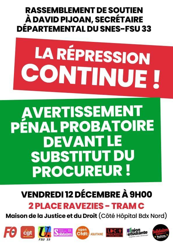 Nous nous sommes très largement mobilisé.e.s le 4 novembre pour soutenir notre camarade David Pijoan, notre co-secrétaire départemental du SNES-FSU GIRONDE. Au lieu de classer sans suite cette procédure infondée, le parquet convoque à nouveau David, cette fois-ci devant un substitut du procureur pour un avertissement pénal probatoire. Cette mesure qui succède au rappel à la loi suppose une reconnaissance de culpabilité et fait subir à la personne concernée une mise à l’épreuve de deux ans. Si n’importe quel type de délit était à nouveau reproché à David, le procureur pourrait décider de le poursuivre devant le tribunal correctionnel.