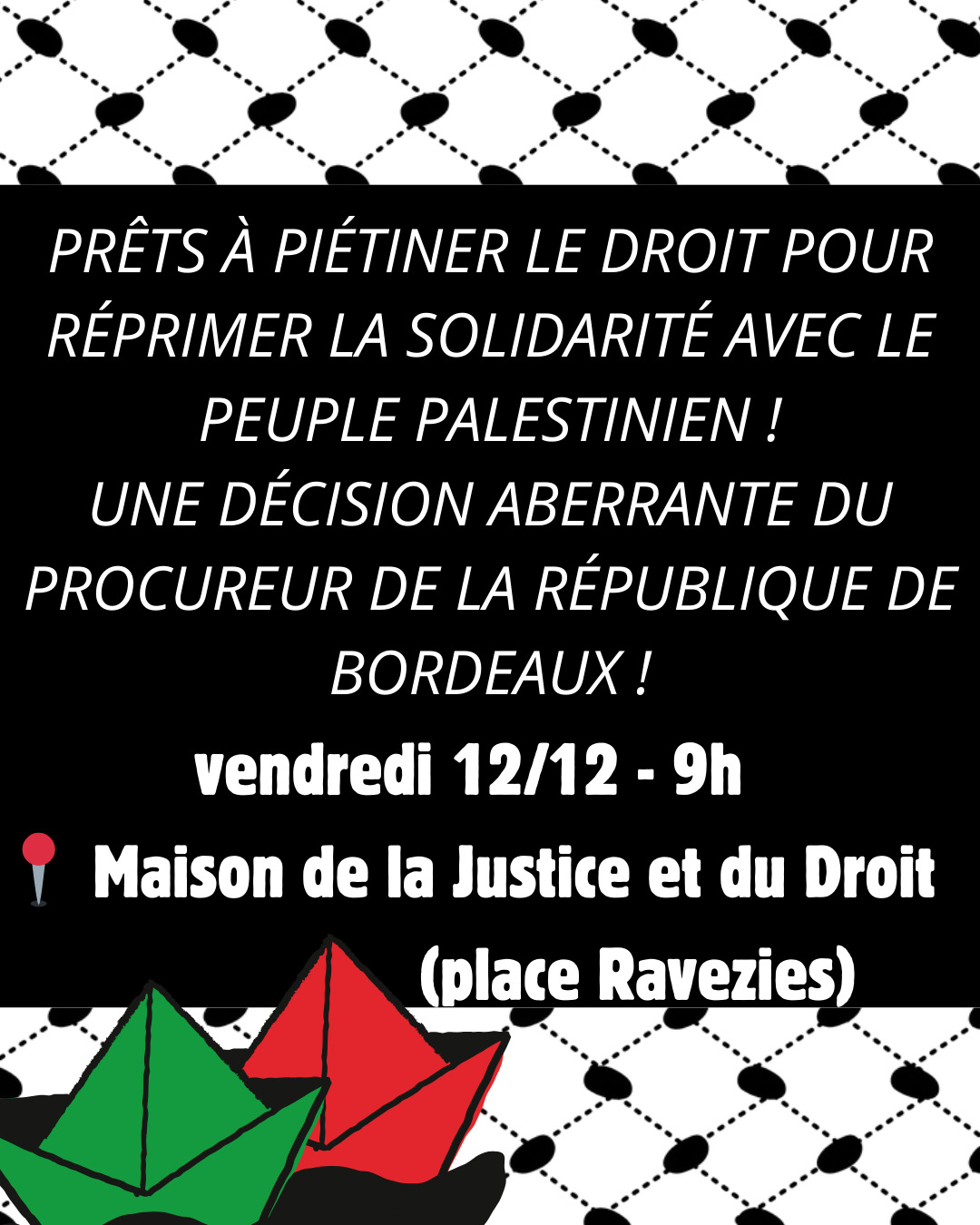 En effet, rappelons que c’est le rassemblement spontané et totalement pacifique du 8 octobre place Pey Berland, à l’occasion de l’arrestation le matin même en violation du droit international de la 2e flottille humanitaire pour Gaza qui a enclenché cette procédure sans fondement. La FSU nationalement comme en Gironde appelait à se joindre, comme de nombreux syndicats, aux mobilisations en solidarité aux flottilles comme initiatives visant à en finir avec le blocus illégal de l’aide humanitaire dans la bande Gaza.