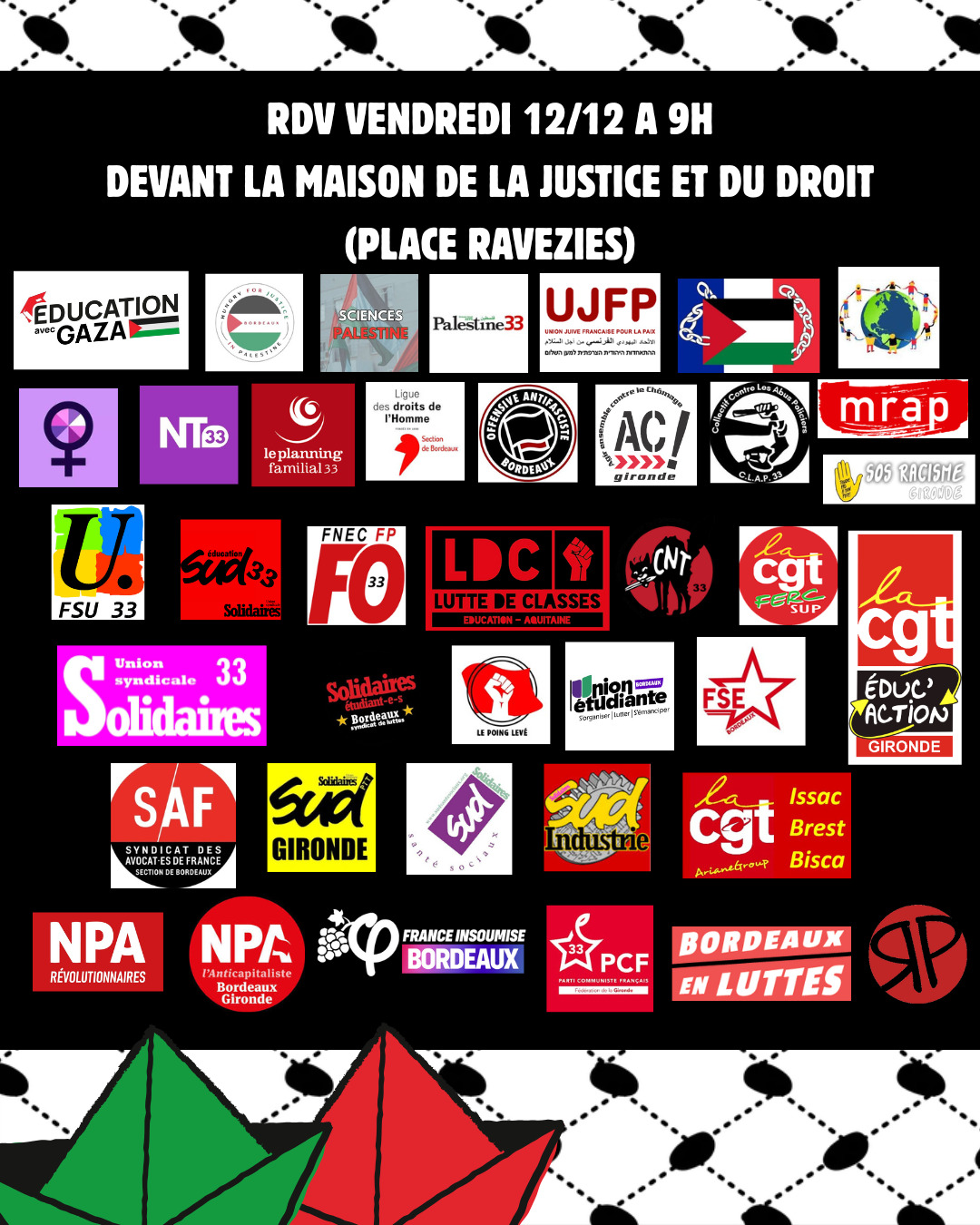 vendredi 12 décembre à 9 heures, devant la Maison de la Justice et du Droit, place Ravezies à Bordeaux
