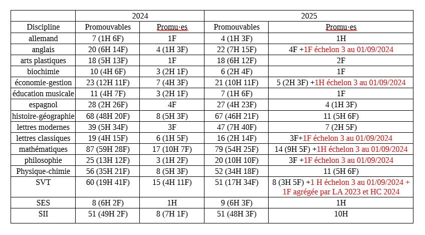 esIl y a eu cette année 263 promotions dans notre académie pour environ 2630 promouvables au 01/09/2024 (en réalité au 31/08/2025 il y avait 2858 promouvables). Le tableau suivant donne la répartition par discipline effectuée par le rectorat.