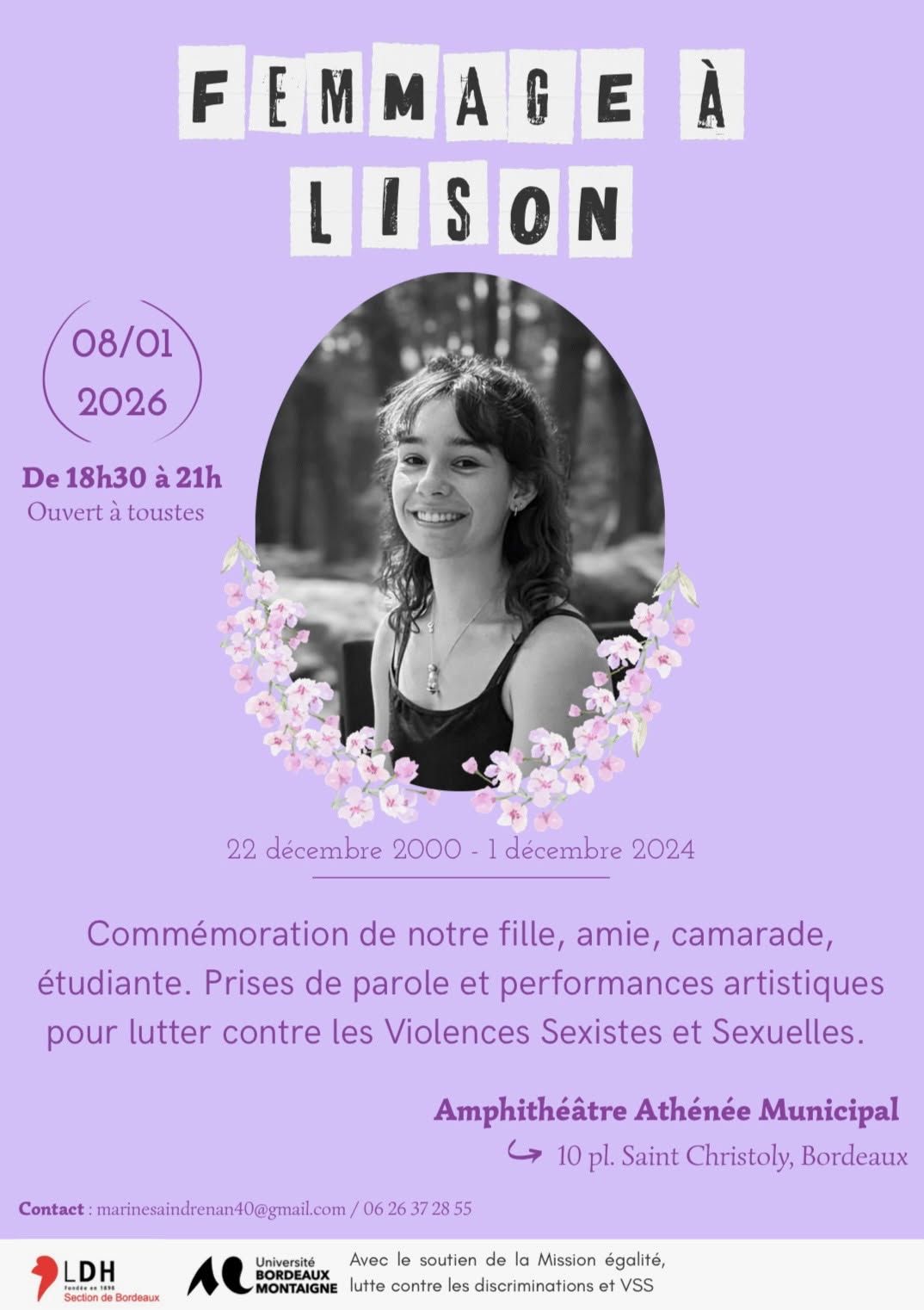 Vous êtes ici : Accueil Actualité Femmage à Lison 19 décembre 2025 Actualité Femmage à Lison Partager l'article sur Facebook Partager l'article sur Twitter Partager l'article via Addthis Imprimer l'article Envoyer l'article par email Le 08 janvier 2026 La section académique vous propose de vous associer au femmage à Lison Méral, victime d’un féminicide le 1er décembre 2024. La lutte contre les violences faites aux femmes nous concerne toutes et tous, toute l’année. Femmage à Lison